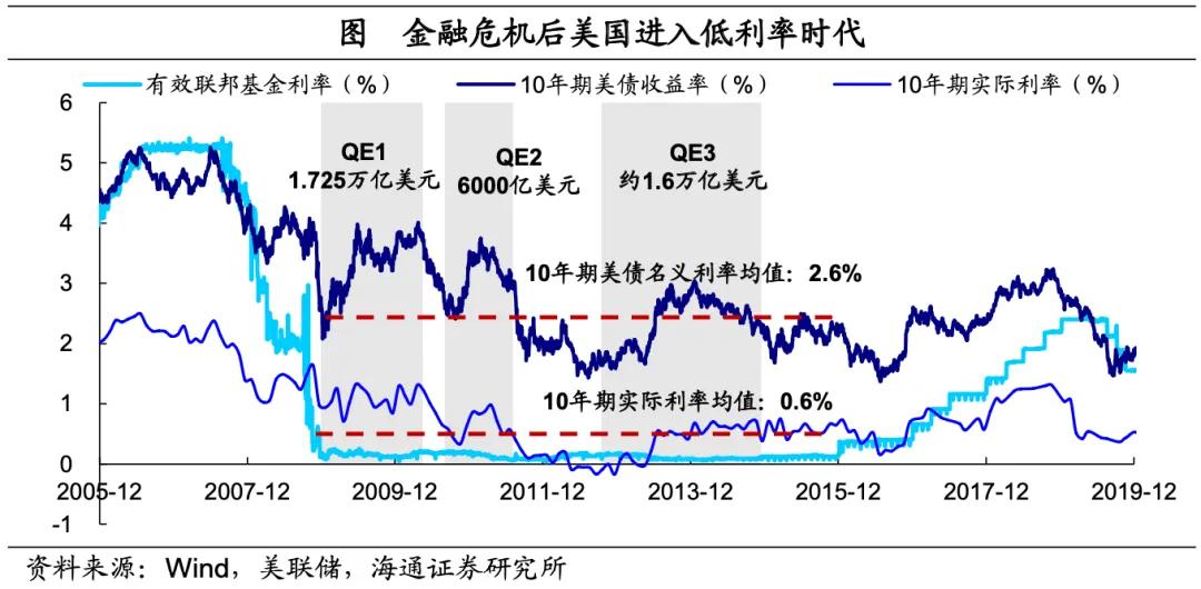 在宽松货币政策影响下,美国进入了低利率时期。短端利率方面,有效联邦基金利率维持在0附近。长端利率方面,10年期美债名义收益率在2009-2015年期间均值仅为2.6%,较2000-2009年4.7%的平均利率水平已有明显回落。10年期实际利率均值也处于0.6%的低位,2012年一度为负。直到2015年12月,美联储将联邦基金利率目标区间上调至0.25%-0.5%。自此,金融危机后一直持续的低利率环境告一段落。