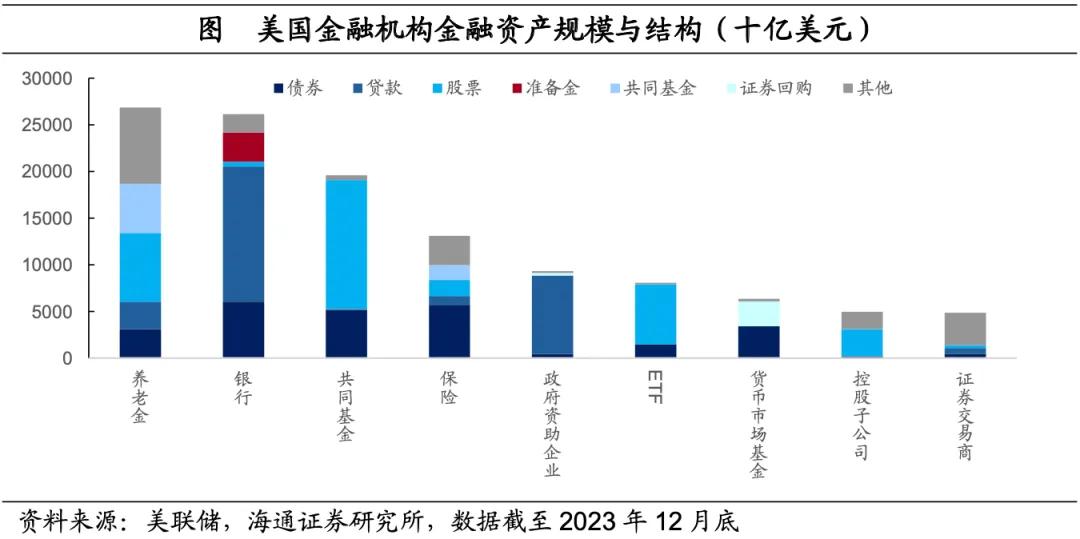 美国金融市场上有哪些主要的参与者?从金融资产规模来看,养老金、银行、保险与共同基金处于前列,其持有金融资产之和占国内金融部门(货币当局除外)的67%。不同金融机构的资产配置结构各不相同:养老金资产规模最大,配置相对分散,股票与共同基金持有比例较高;银行业资产以贷款为主;共同基金主要投资股票;保险机构则更多持有债券。
