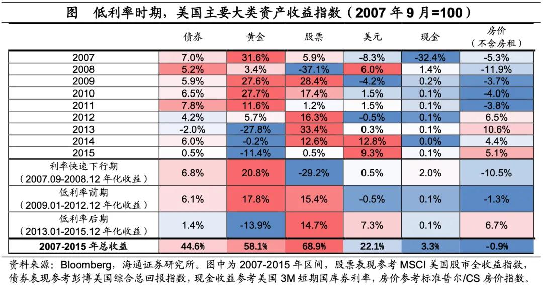 在美国2007-2015年低利率期间,大类资产总体呈现:股票>黄金>债券>汇率>通胀>现金>房地产。其中,含股息的股票指数累计涨幅近70%,含票息的债券指数累计涨幅45%。而由于美国经历了房地产泡沫破裂,地产走势偏弱,房地产(不含房租)的收益在低利率时期内未能跑过通胀。