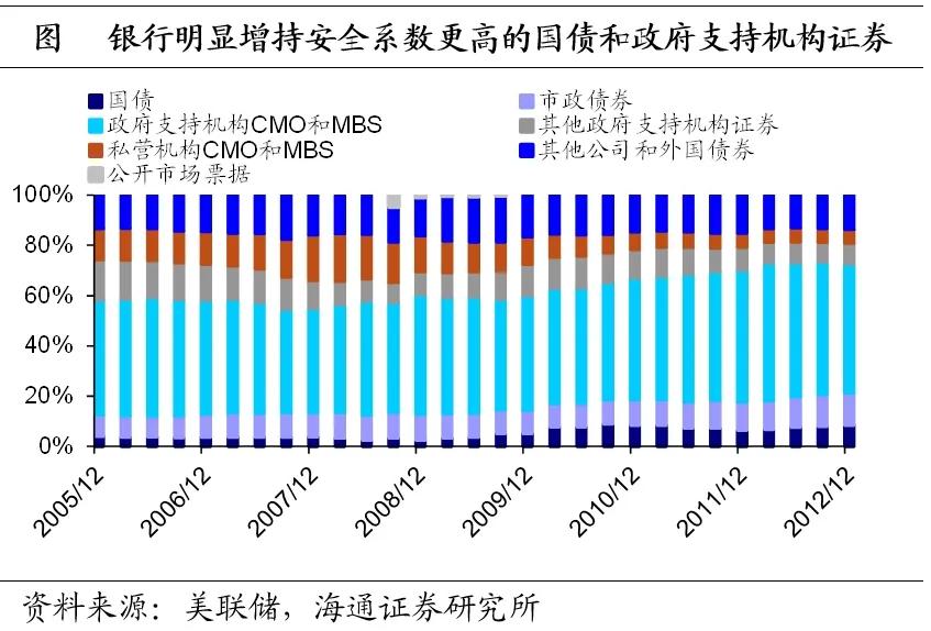 由于在低利率后期(2013-2015年),美国经济持续修复,股价涨幅亮眼,房价也持续回升,金融机构即使处于低利率环境也并未面临“资产荒”的挑战。并且,货币政策在2013年已开始酝酿退出,市场对货币政策宽松的预期也已有所动摇。因此,这一时期的参考价值或相对有限。在接下来的分析中,我们重点对利率快速下行期和低利率前期(2007-2012年)中金融机构的资产配置进行分析。