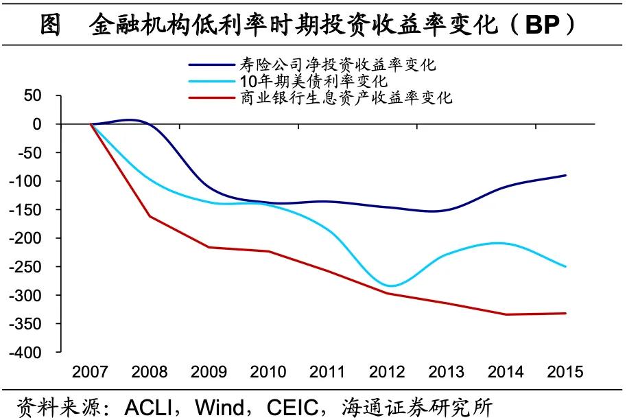 在低利率时期,由于投资收益率下滑,金融机构普遍面临利差压降的压力。横向对比来看,保险机构承受的利差收缩压力更大。以寿险公司为例,其净利差由2007年的1.8%回落至2015年的1.1%,下滑70BP左右。相比之下,美国商业银行净息差在2007-2015年期间仅回落20BP。