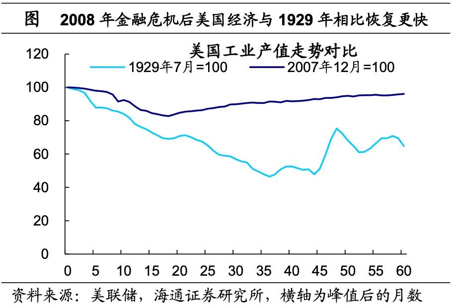总体来看,和1929-1945年相比,虽然同样经历了低利率时期,但美国经济在2007-2015年恢复的更快,低利率持续的时间也更短。例如,2007-2015年期间,美国工业产值下跌幅度明显低于1929-1945年,并且自2009年下半年便已开始企稳回升。股票市场也并未经历长时间的低迷,2009年3月便开始了持续的回升趋势。