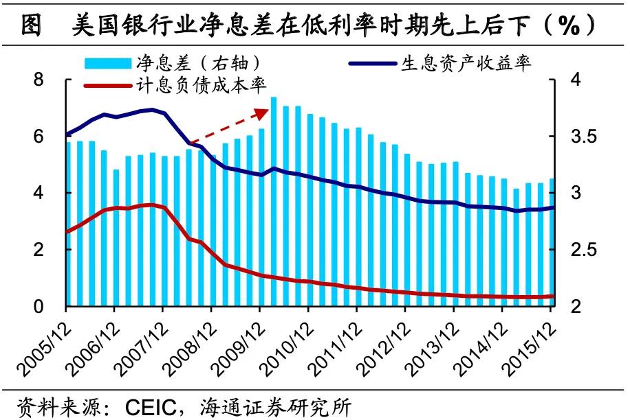 在利率快速下行期,美国商业银行计息负债率下降幅度甚至大于生息资产收益率的下降幅度,导致净息差不降反升。不过在之后持续的低利率环境中,负债端成本下行空间受限,资产端收益率的持续回落也开始带动净息差逐渐下行。