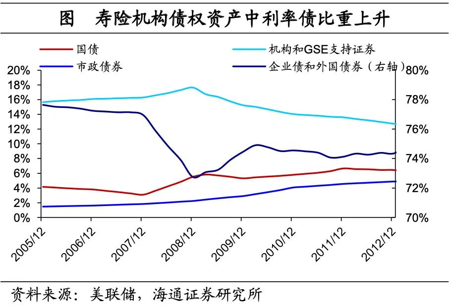 总结来看,在利率快速下行期和低利率初期(2007-2012年),美国金融机构均不同程度地增加了对债券的配置,尤其对国债普遍增持。这一方面与利率下行期,债券资产资本利得收入较为可观,对金融机构资产配置的吸引力增加有关。另一方面也与国债供给增加有关。