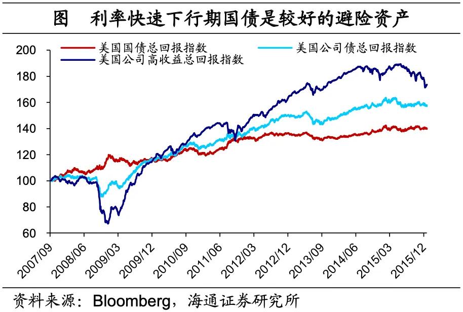 从不同种类债券表现来看,利率快速下行期,国债是债券资产中较好的避险选择。在这一时期,受金融危机期间信用违约增加以及市场恐慌情绪加剧影响,信用溢价明显上升。公司债总回报指数与公司高收益债券总回报指数均有明显下跌。尤其高收益公司债券在2008年12月已较2007年9月下跌了26%。而安全性更高的国债在这一时期有较好的表现,累计收益达19%。