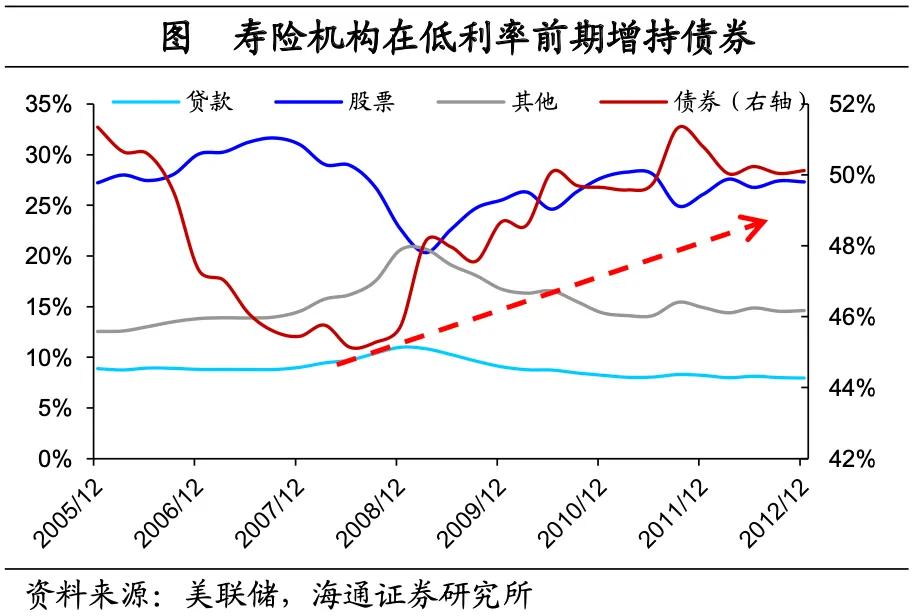 对保险机构而言,在利率快速下行期和低利率前期(2007-2012年),其资产配置呈现:1)增配债券,减持股票配置。以寿险机构为例,债券资产占比在2012年较2007上升5个百分点至50%,股票占比则由2007年的31%回落至2012年的27%。