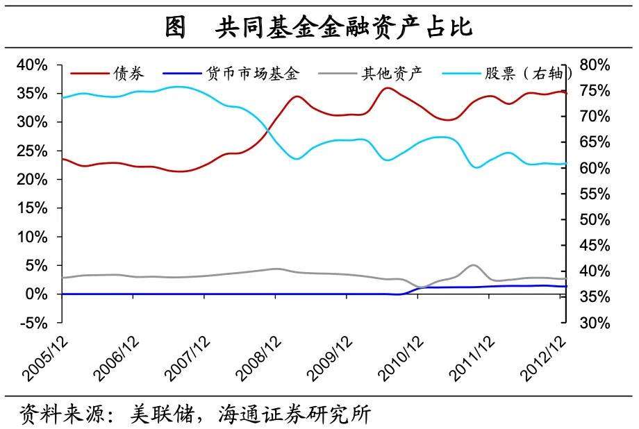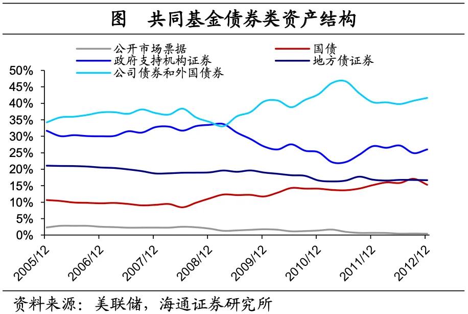 对共同基金而言,其资产配置反映居民的资产配置偏好,同样呈现增持债券类资产,减持股票的特点。截至2012年,债券资产占比较2007年底提升了12个百分点,股票占比则下滑13个百分点。从债券资产结构来看,共同基金同样增持了国债。2012年,国债占债券资产总比重较2007年上升6个百分点至15%,不过,与银行和保险机构不同的是,共同基金在低利率时期仍明显增持了公司债券和外国债券。截至2012年底,共同基金公司债券和外国债券占债券类资产比重较2007年提升了近5个百分点。