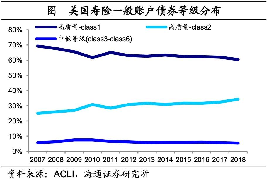 3)信用下沉。从债券资产质量结构来看,寿险公司适当降低了高质量(1级)债券的占比,从2007年的69%下降至2015年的62%,同时高质量(2级)债券占比从2007年的25%提升至2015年的32%。