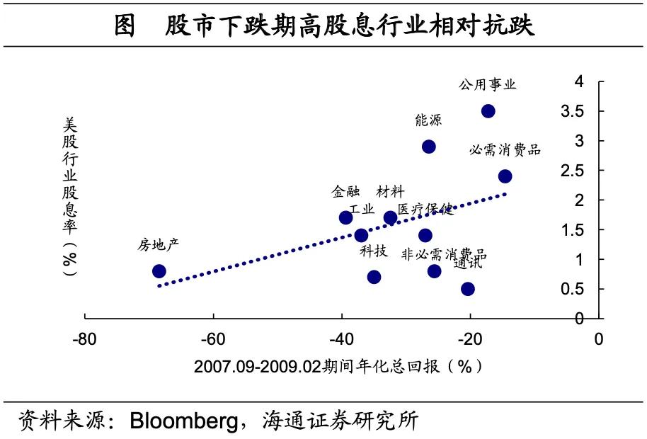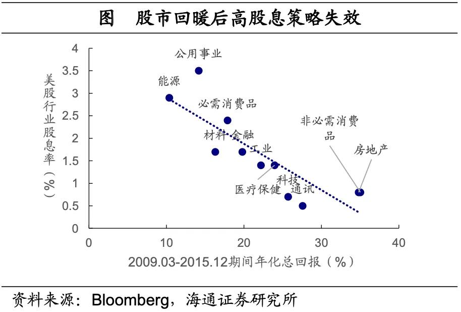 在股市下跌期,确定性更强的高股息行业更抗跌,如公用事业、能源、必需消费品等。这也反映出在经济衰退,风险偏好下降的环境下,具有防御属性的高股息策略具有明显的相对优势。而当股市企稳回升后,高股息策略则开始失效,成长性更高的行业反弹更加明显,如非必需消费品、通讯、科技、医疗保健等行业。此外,前期跌幅较大的房地产行业在股市回暖后反弹幅度也较为可观。