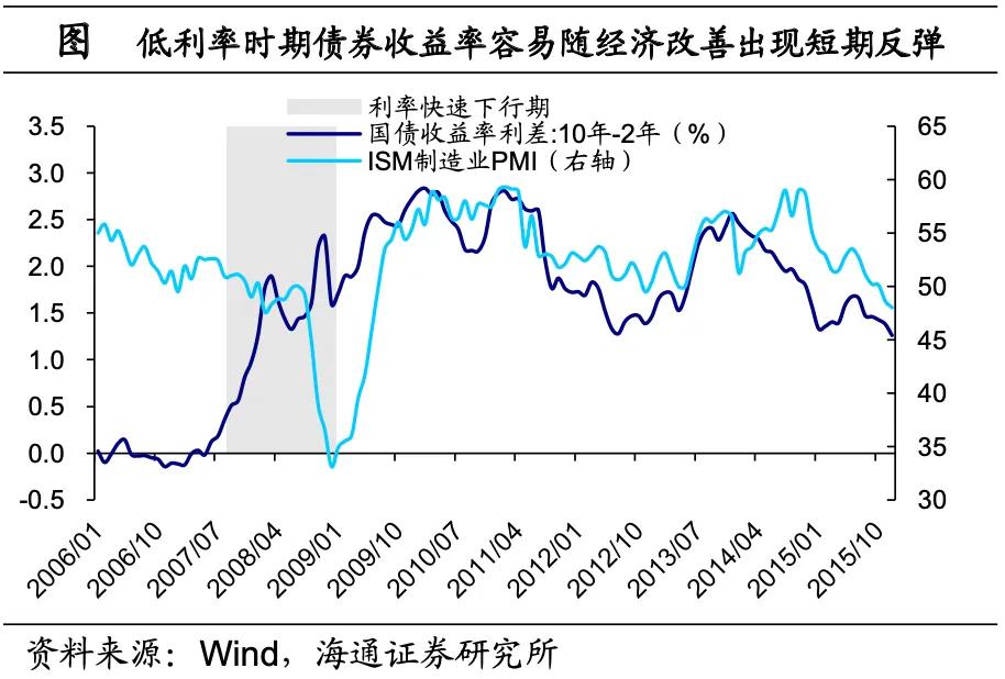而随着利率逐步下行至低位,债券收益率进入震荡格局(2009-2015年)。这一阶段利率曲线形态对经济基本面走势相对敏感。例如在2011年美国经济走弱时曲线呈现“牛平”行情。而如果经济边际改善或者预期宽松货币政策可能退出,长端债券利率也容易出现反弹,曲线趋于陡峭。例如2013年“缩减恐慌”引发的美债收益率急剧上升。