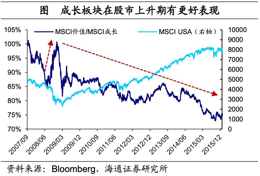 从风格上来看,在2008年9月至2009年3月的股市急速下跌期,大盘股以及价值股的表现更加占优。而在经济回升后的牛市行情中,成长空间更大的小盘股与成长股的回报更高。