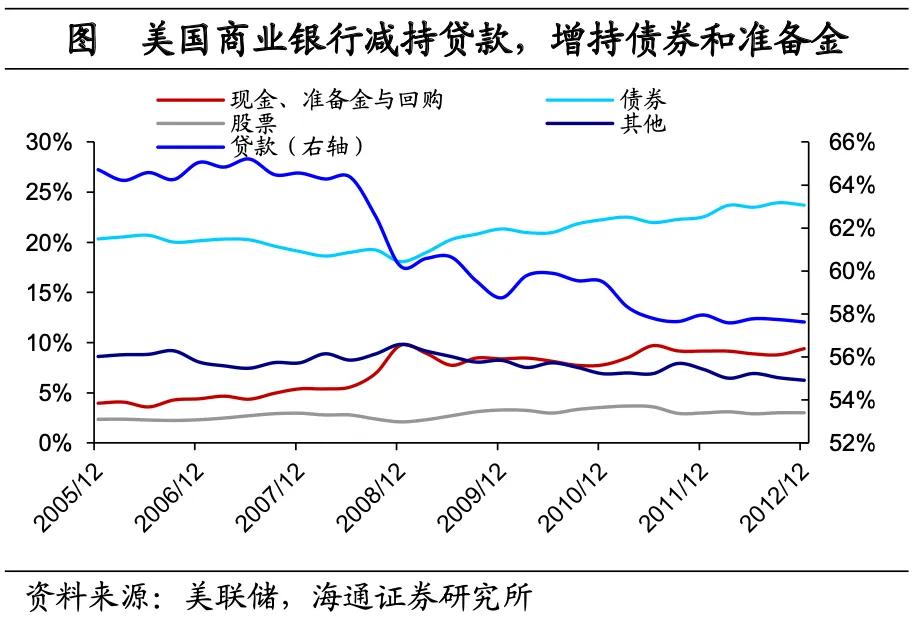 3)准备金规模明显上升。这主要是因为美联储在金融危机后先后进行了三次量化宽松政策,通过大规模资产购买给商业银行注入了大量准备金。此外,美联储在2008年后开始为商业银行准备金支付利息,并且美国出台了一系列监管政策鼓励商业银行增加流动性资产,均增加了商业银行持有准备金的动机。2012年,美国现金、准备金和回购资产占比较2007年上升4个百分点至9.4%。
