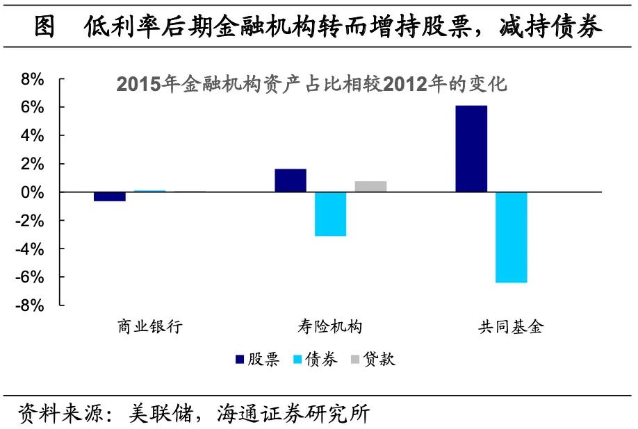 而到了低利率后期(2013-2015年),经济持续回升、股票市场表现亮眼、货币政策酝酿退出、利率债面临一定调整压力。金融机构对债券资产的偏好下降,转而增持股票资产。具体来看,共同基金与寿险公司均在这一阶段增持了股票,而商业银行资产配置则调整不大。