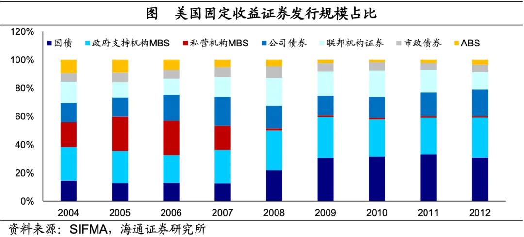 在经济低迷期,私人部门融资需求偏弱,政府加大国债供给托底经济。从美国固定收益市场发行结构来看,国债发行占比由2007年的12.6%大幅上升至2012年的30.9%。政府支持机构MBS发行占比也提升5个百分点至28.4%。相比之下,私营机构MBS发行明显萎缩,其占比在2007年高达17%,而在2012年时仅剩为1%。