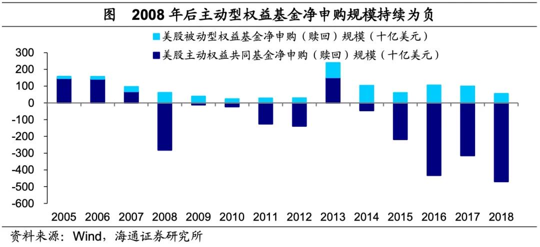 此外,被动型权益基金在2008年后也较受欢迎。金融危机后,市场开始出现资金持续从主动类基金流出,转向流入ETF和指数基金的现象。这一方面是由于被动型产品收益率在过去十年均能战胜主动型产品,并且费用率更低、权益仓位更高,性价比更加突出。另一方面,美国投顾在为基民推荐产品时也更倾向于历史收益更高且费率更低的被动型产品,也一定程度上推动了被动型基金的扩张。